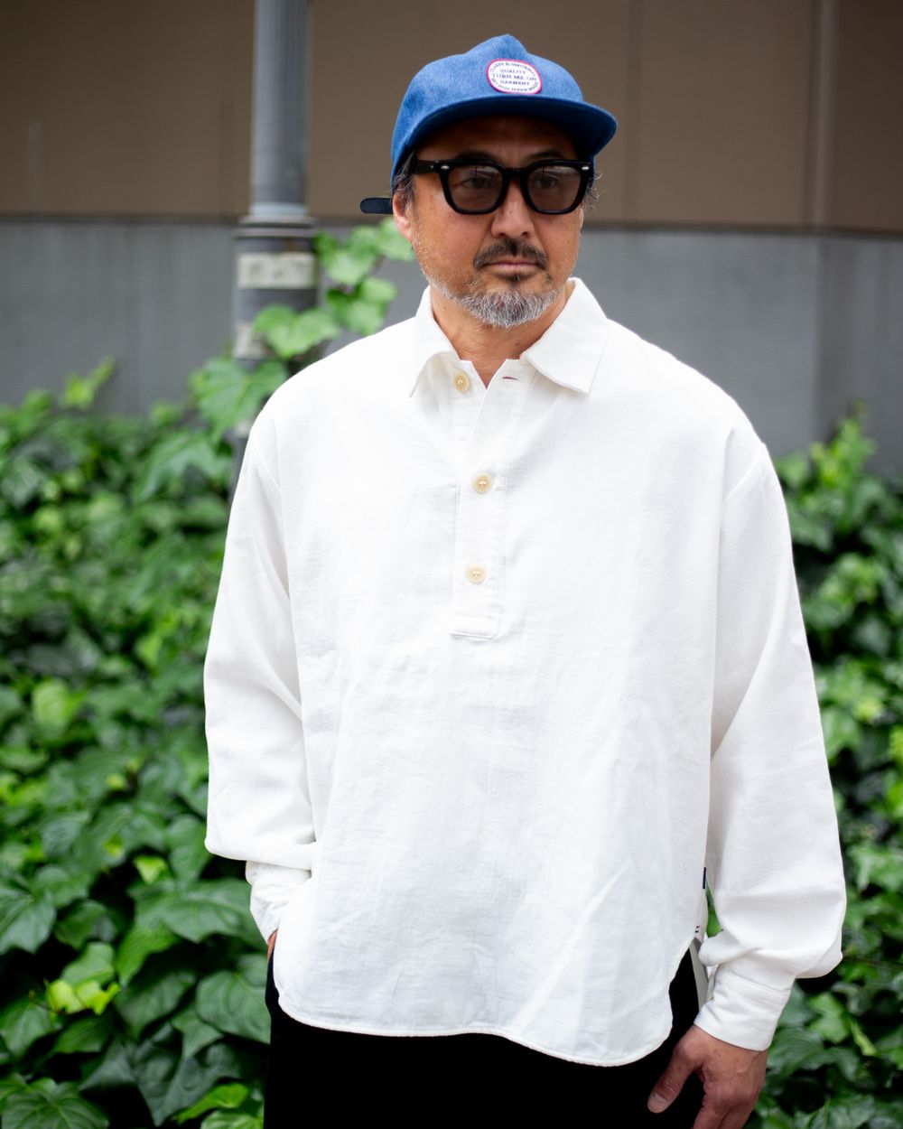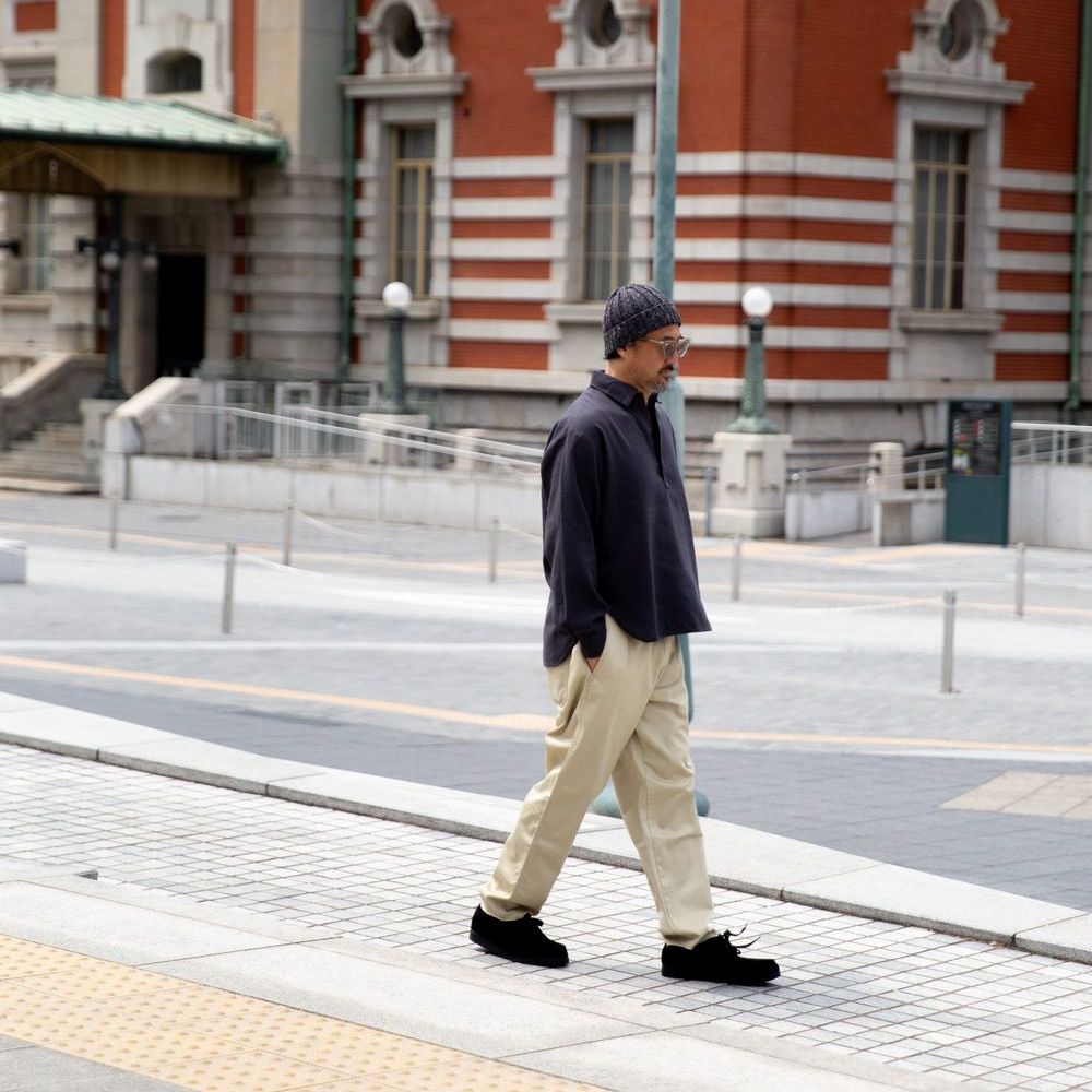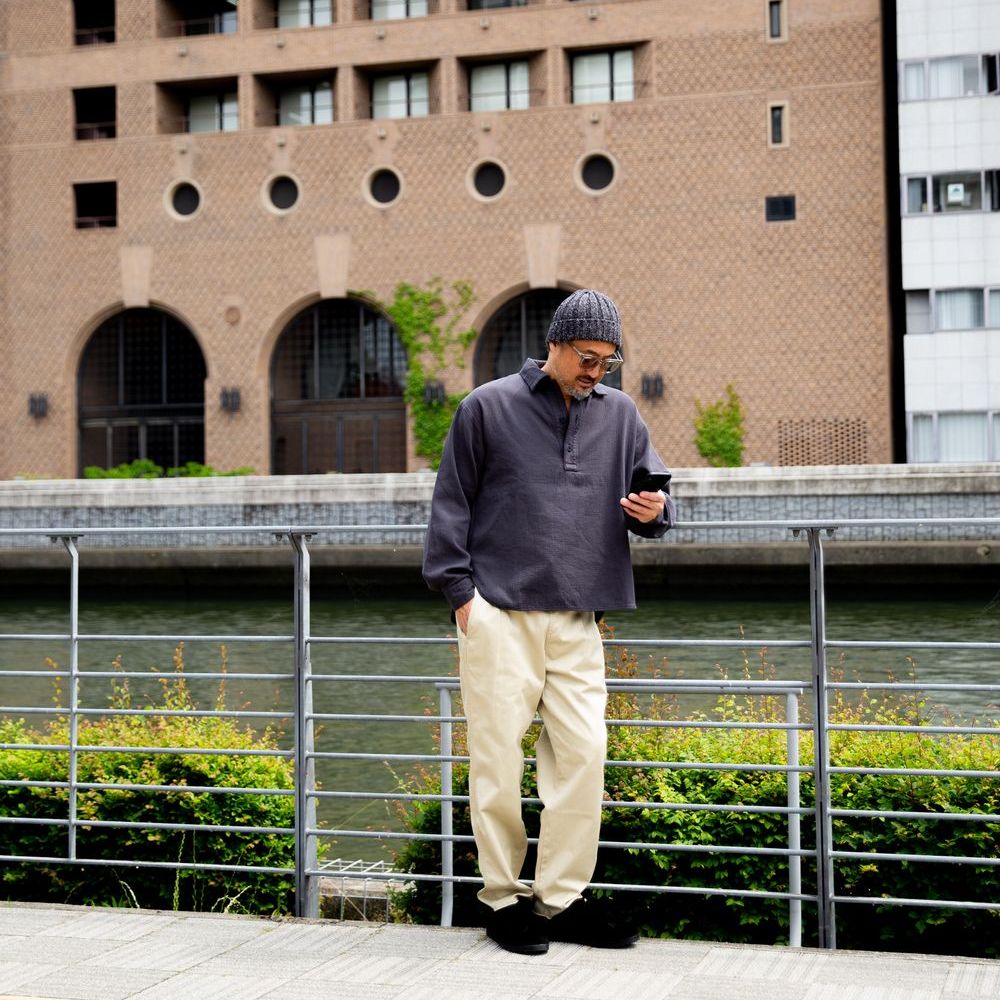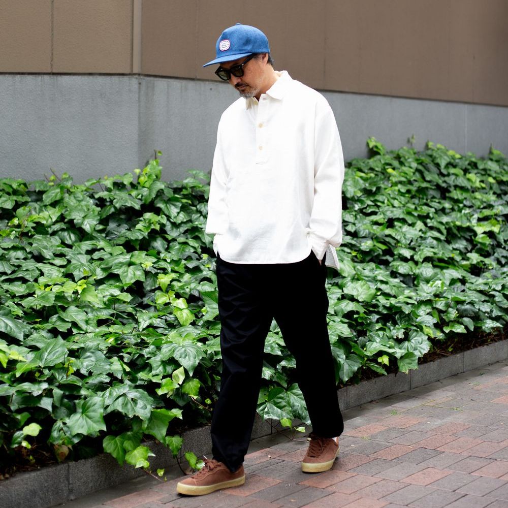 トップを留めずにラフなスタイリングも抜群に恰好良いです。肌触りをお伝え出来ないのが残念でなりませんが、ぜひお手に取っていただきたく思います。また使い込むことによりさらに風合いが良くなっていくことも付け加えておきます。張りがあるのに柔らかさも持つ、プルオーバーの可愛らしさもポイントです。十分な身幅と腕周りにゆとりを持たせることで、動きやすさとストレスを感じさせずに格好良くいられます。オフホワイトの感じも絶妙で、真っ白過ぎない柔らかな感じとでもいいましょうか。パンツとの相性は様々な素材のモノと合わせられるので、1枚は持っておいてほしいと思います。冬に向かってインナーとして使う際にもオフホワイトは何にでも合わせやすく使いやすい。万能なカラーリングと言えるでしょう。